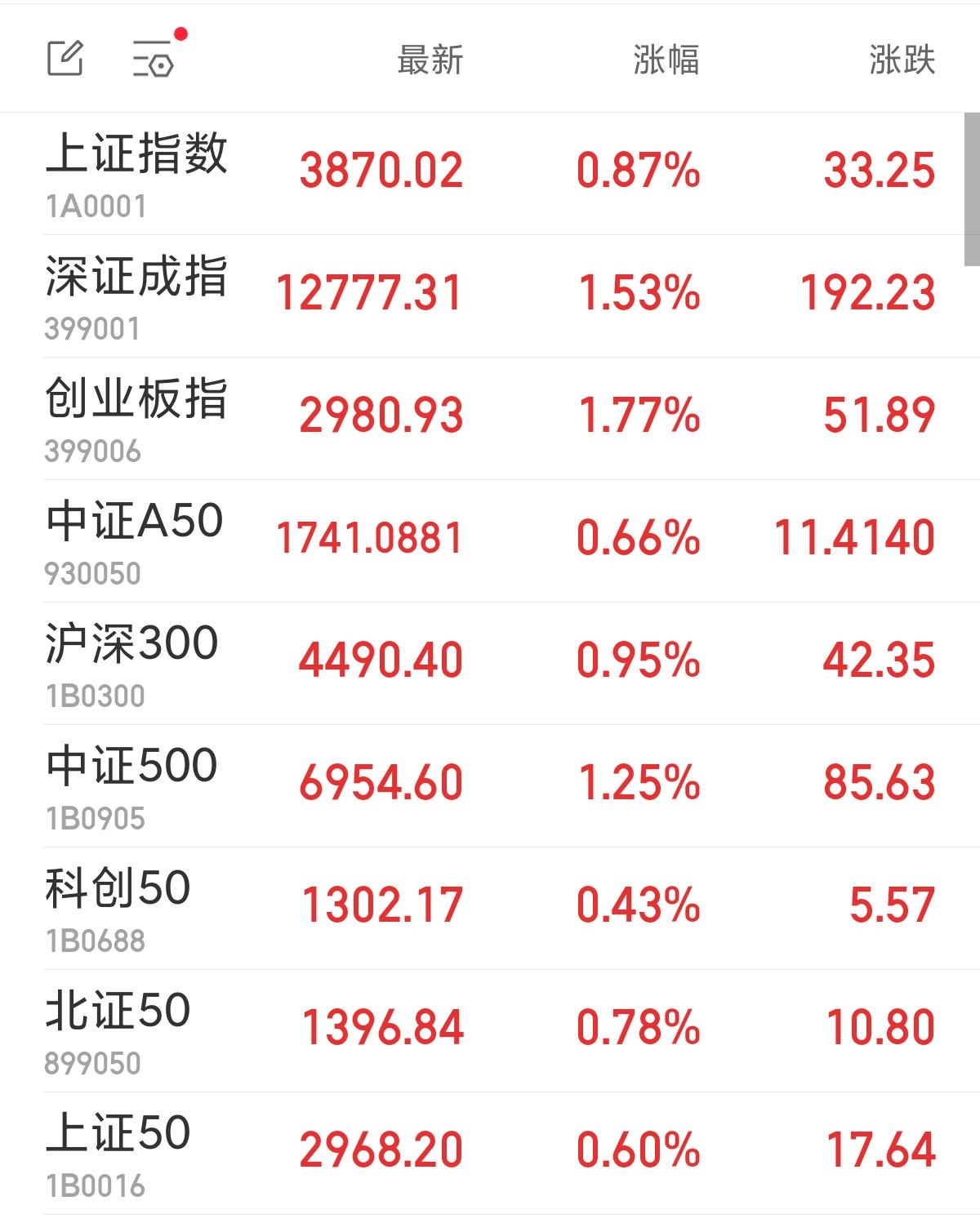 中新经纬11月25日电 周二,A股三大指数高开高走。截至收盘,上证指数涨0.87%,报3870.02点;深证成指涨1.53%,报12777.31点;创业板指涨1.77%,报2980.93点。