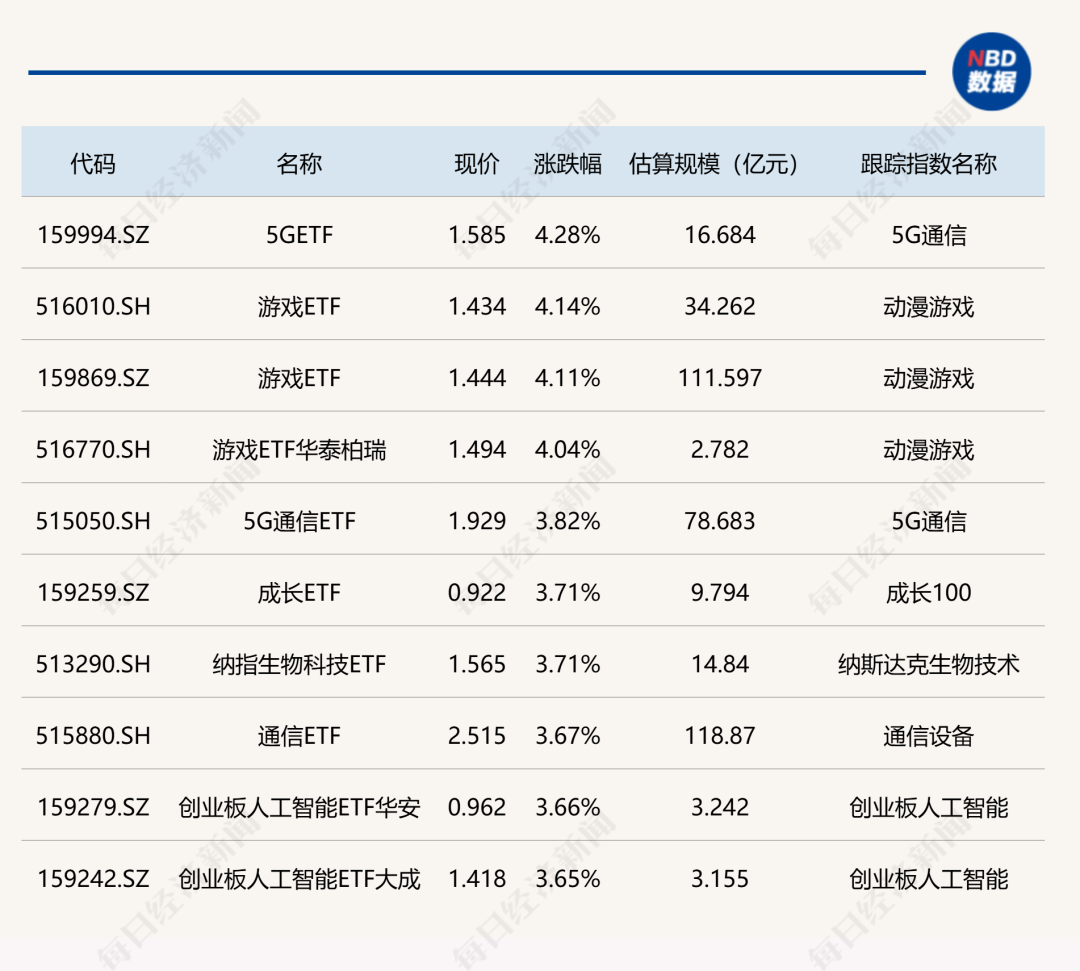 ETF涨跌幅方面,5G、游戏相关ETF涨超4%。