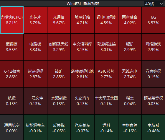 Wind数据显示,截至收盘,热门概念指数中光模块(CPO)、光芯片、光通信等AI硬件题材涨幅明显领先。