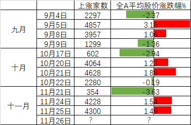 从个股情况来看,Wind数据显示,截至周二,市场已连续两日超4000家上涨,这一点其实和9月、10月两次大跌后反弹的情况相似。