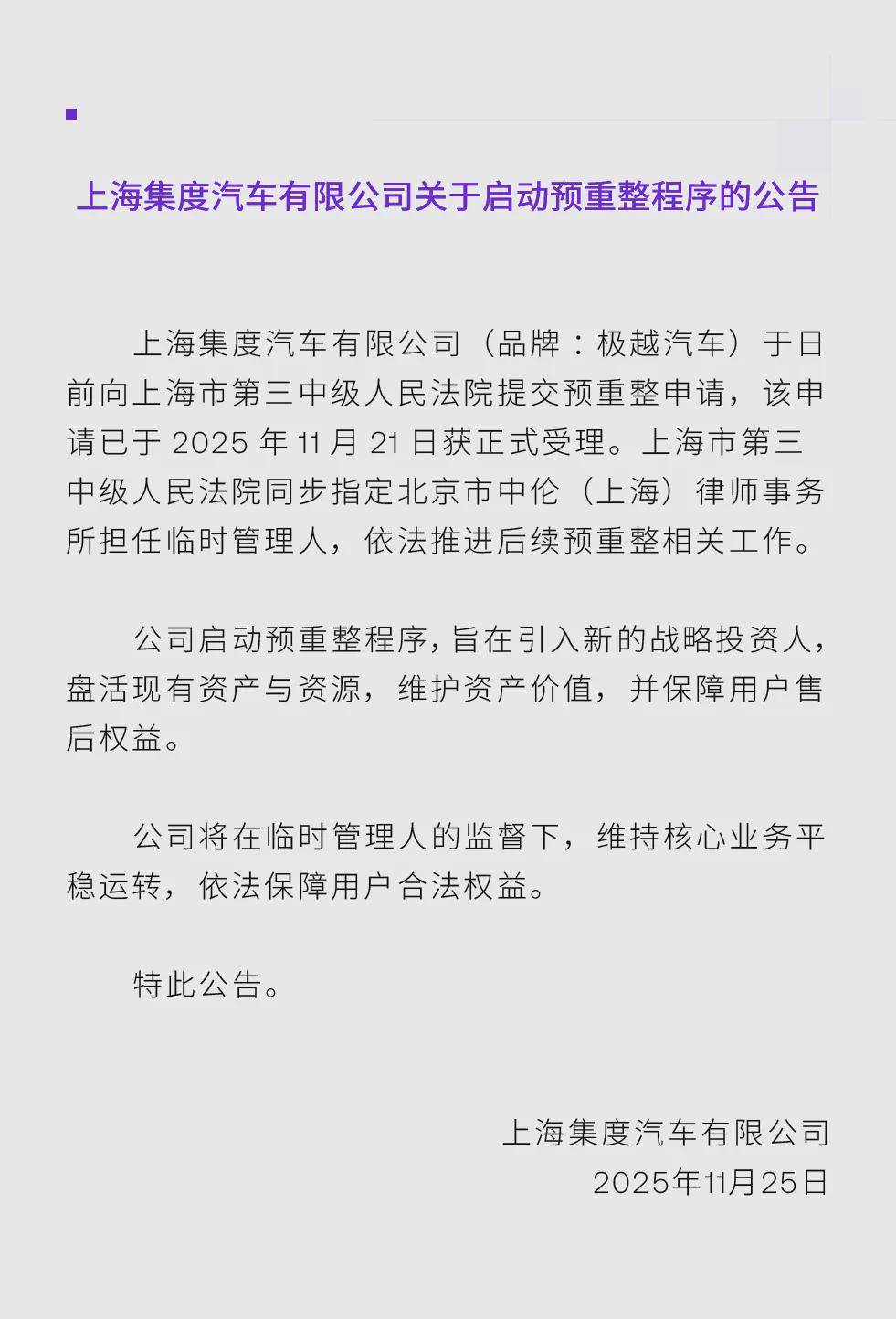 中新经纬11月25日电 据“极越”微信公众号25日消息,上海集度汽车有限公司发布关于启动预重整程序的公告。