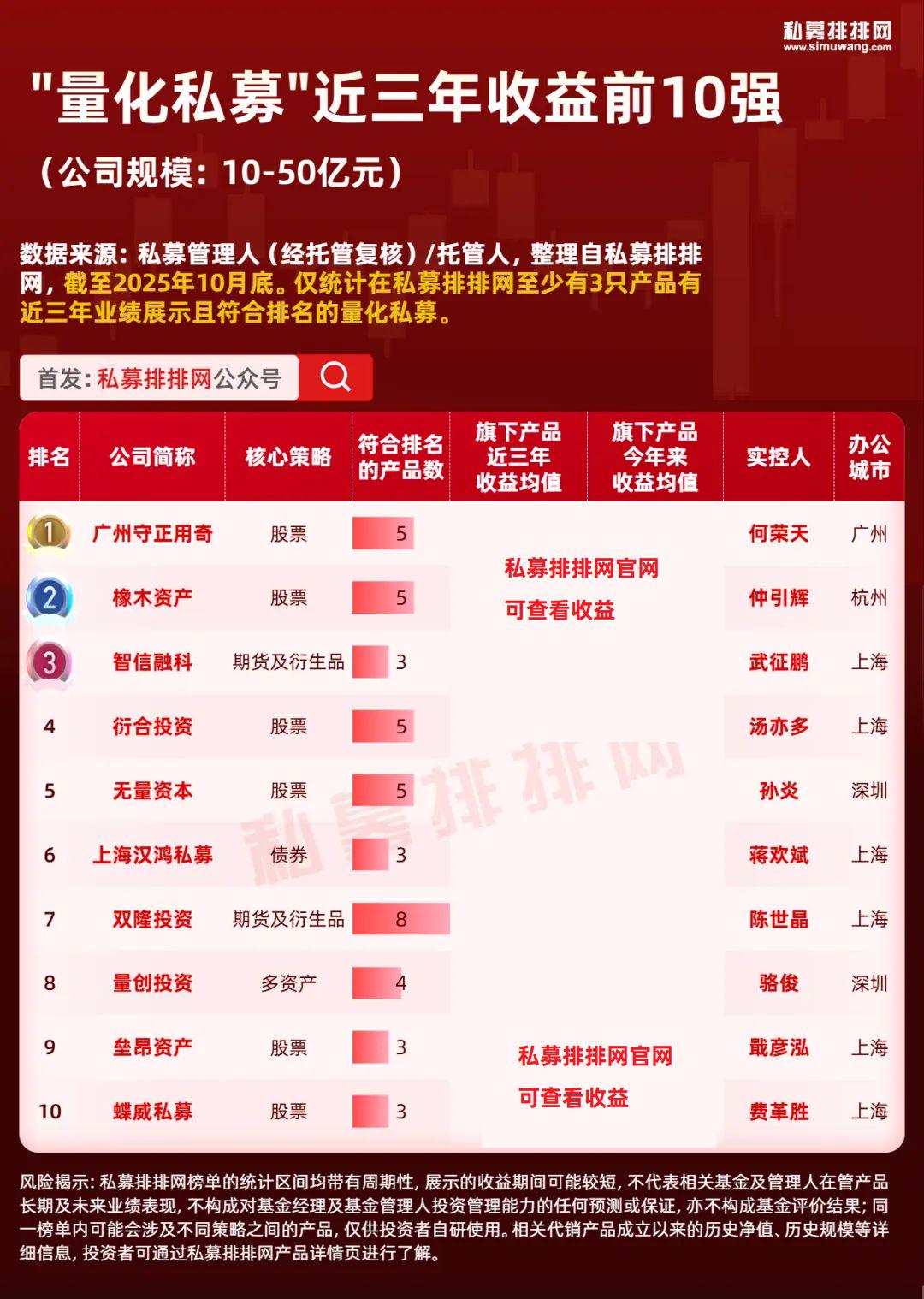 截至2025年10月底,至少有3只产品在私募排排网有近三年业绩展示的10-50亿规模量化私募共有25家。10强私募的上榜“门槛”接近***%,股票策略私募占6家。