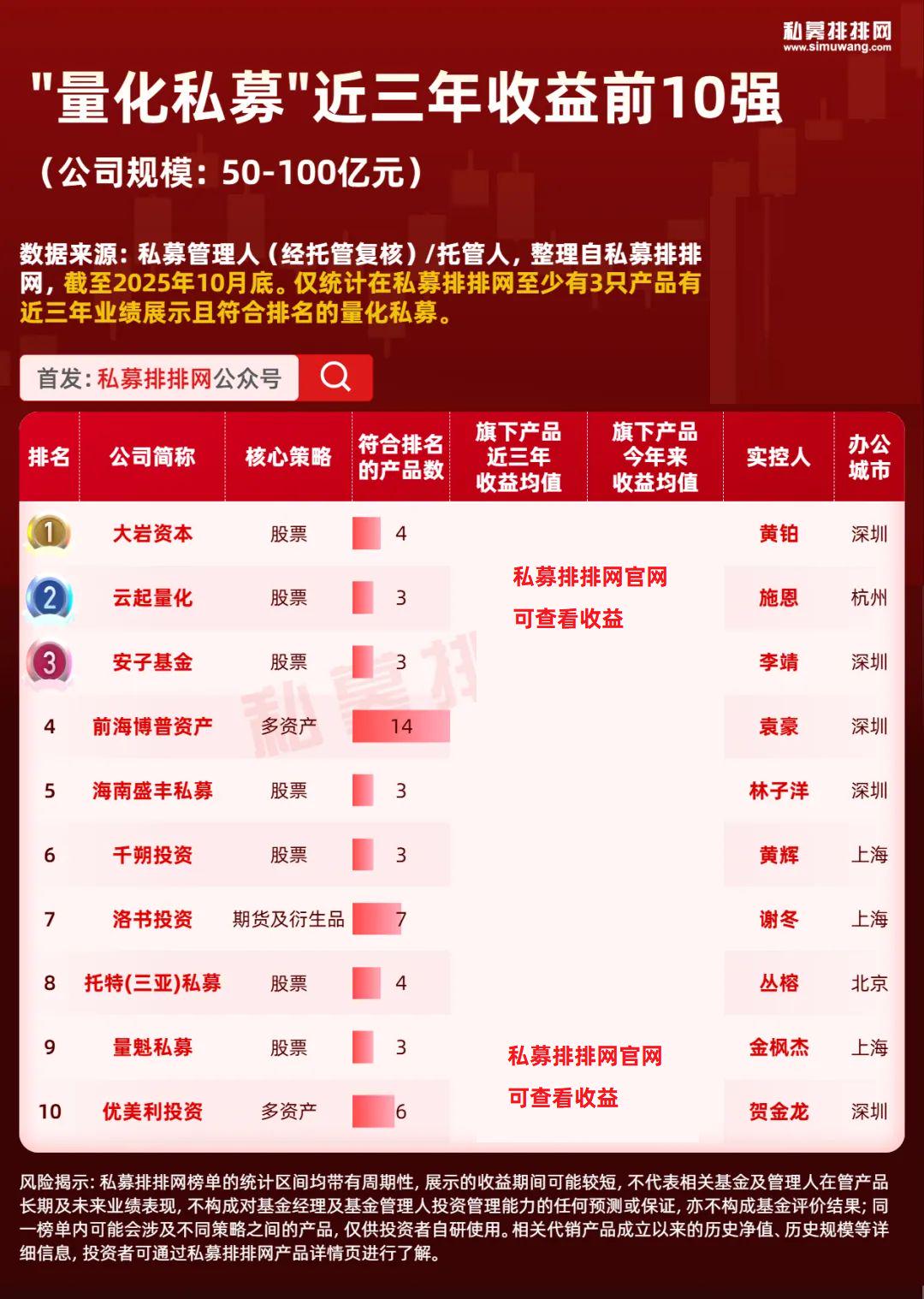 截至2025年10月底,至少有3只产品在私募排排网有近三年业绩展示的50-100亿规模量化私募共有18家。