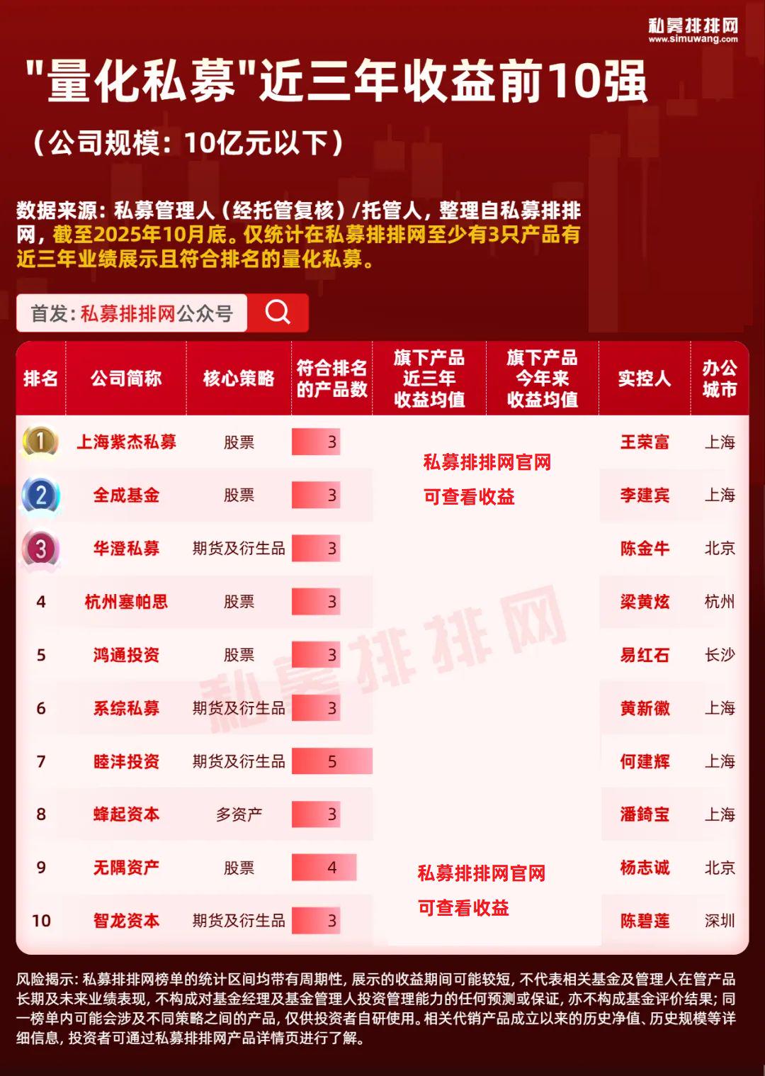 截至2025年10月底,至少有3只产品在私募排排网有近三年业绩展示的10亿以下规模量化私募共有33家。10强私募的上榜“门槛”超***%,股票策略私募占5家,期货及衍生品策略私募占4家。