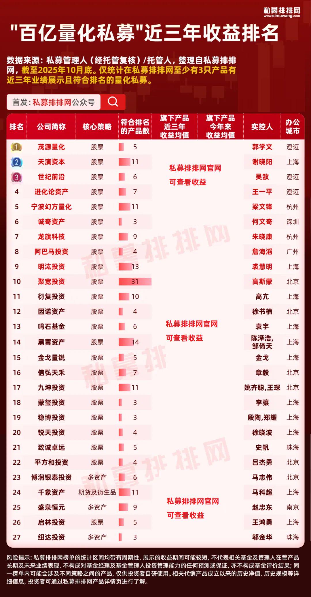 百亿量化私募作为量化私募中的头部公司,备受市场关注。据私募排排网数据,截至2025年10月底,至少有3只产品在私募排排网有近三年业绩展示的百亿量化私募共有27家。