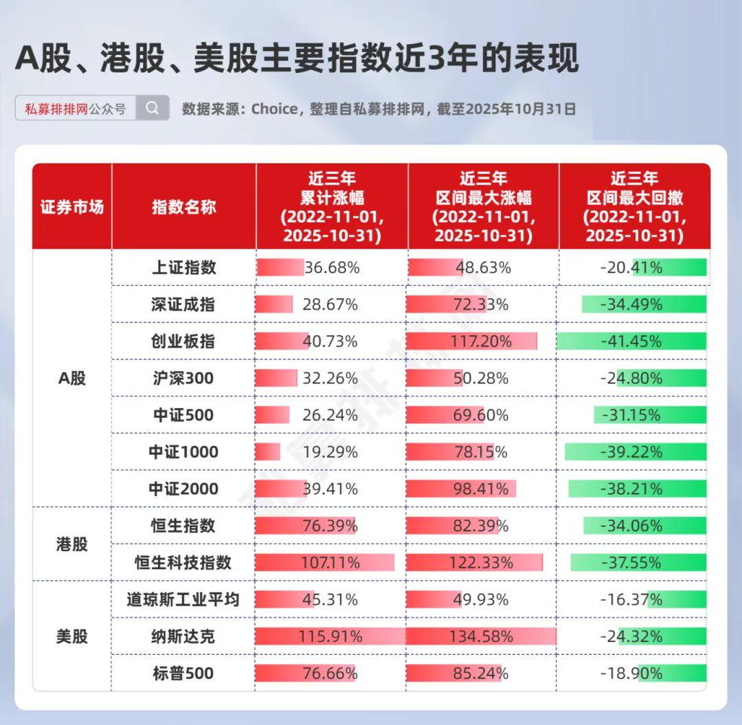 近三年来(2022年11月-2025年10月),经历了美联储由加息周期转向降息周期,俄乌、中东等地缘冲突,美国对多国加征关税等一系列扰动,受此影响,资本市场也出现了较大的波动。A股以2024年9月为分水岭,经历了由熊转牛的过程。累计涨幅来看,近三年,A股、港股、美股主要股指均有亮眼表现,其中,港股和美股更为强势。