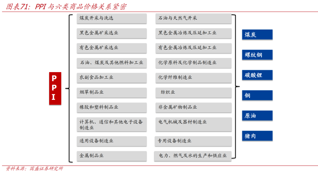 具体看,六类商品包括:1)煤炭:主要影响PPI煤炭采选、电力燃气及水的供应业;2)原油:主要影响PPI石油开采、石油加工、化工化纤;3)螺纹钢:主要影响PPI黑色采选、黑色冶炼、汽车制造、电气机械、计算机通信电子制造、金属制品、通用设备、专用设备;4)铜:主要影响PPI有色采选、有色冶炼、电气机械、金属制品、通用设备、专用设备;5)碳酸锂:主要影响PPI汽车制造、计算机通信电子制造;6)生猪:主要影响PPI农副食品加工。