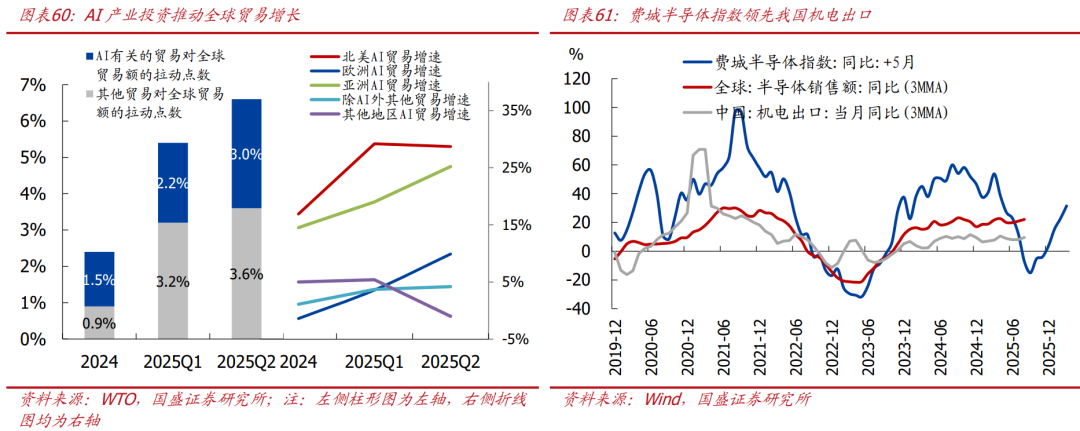 三是AI产业投资推动相关产品贸易,北美和亚洲受益更深。2025年上半年,AI相关产品贡献了近一半的全球贸易增长,尽管占全球商品贸易的比重不到十分之一;分地区看,北美和亚洲AI相关产品贸易增速远高于其他地区,整体受益更深。AI作为当今产业趋势,代表着数字基础设施投资的长期结构性浪潮。受全球经济波动和政策变化的影响较小,因此相关产品贸易也更加稳定,对我国机电出口形成有力支撑。