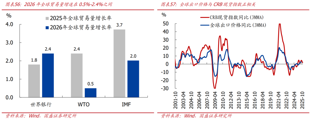 首先,从量、价两个维度考察全球贸易:量的方面看,全球央行降息、通胀下行有助于需求改善,但关税对经济的负面效应仍待观察,按照WTO、世界银行、IMF等国际机构预测,2026年全球贸易量增速在0.5%-2.4%之间,不同机构预测差距较大。价的方面看,全球商品出口价格跟CRB现货指数高度正相关,根据商品期货价格曲线预测2026年主要商品价格,并根据CRB指数编制规则进行加权,可得2026年出口价格同比增速在1%左右。换言之,考虑量、价两方面,如果中国占全球出口份额保持稳定,那么2026年我国出口的基础增速在1.5-3.4%左右。