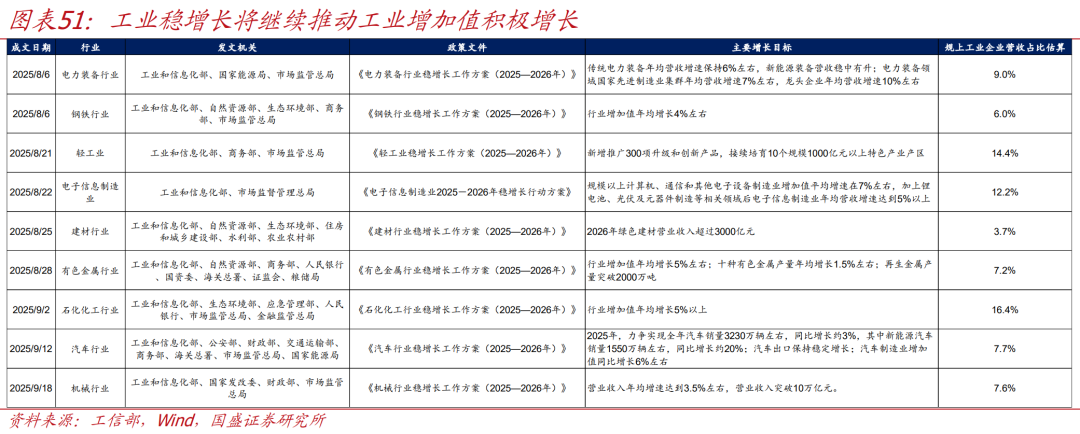 工业生产方面,1-9月工业增加值同比6.2%,较2024年的5.8%进一步走高,应和出口韧性较强的支撑有关。四季度至2026年,考虑到出口韧性仍强,消费、投资等内需可能温和修复,工业稳增长对电力装备、钢铁、轻工、建材、有色金属、石化化工、汽车等行业做出要求,预计2026年整体工业生产增速将延续高增。