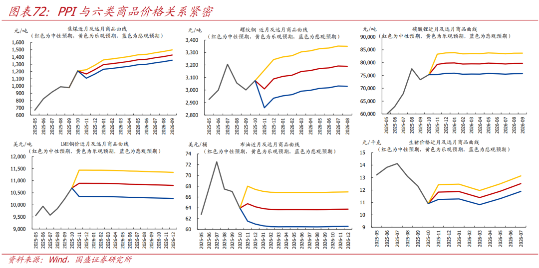 >反内卷政策的实施力度和落地效果,将决定煤炭、螺纹钢和碳酸锂的价格走势。中性情形下,我们以当前(2025年10月)商品期货价格曲线来预测商品价格:1)当前焦煤价格约为1200元/吨,2026年底预计上行至1440元/吨;2)当前螺纹钢价格约为3100元/吨,2026年底预计小幅上行至3200元/吨;3)当前碳酸锂价格约为8万元/吨,预计2026年基本维持这一水平。