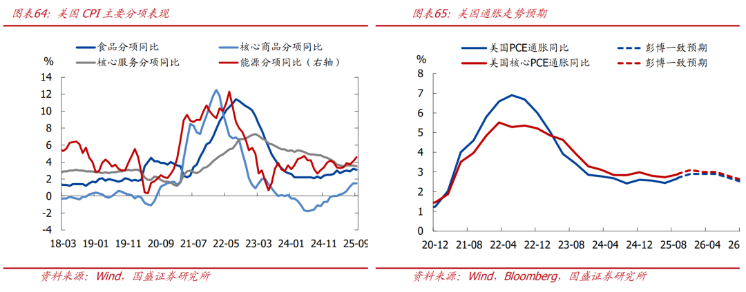 1)美国物价:预计先升后降,绝对水平仍偏高。回顾2025年,美国通胀整体震荡走平,关税影响弱于市场预期。前三个季度,美国PCE通胀和核心PCE通胀整体呈震荡走势,中枢分别为2.6%、2.8%,与2024年相比变化不大,仍明显高于美联储2%的目标。分项看,核心商品和食品通胀有所抬升,主要是受关税影响;但核心服务通胀持续回落,主要反映了经济和就业的下行,也在很大程度上对冲了商品通胀的上行。