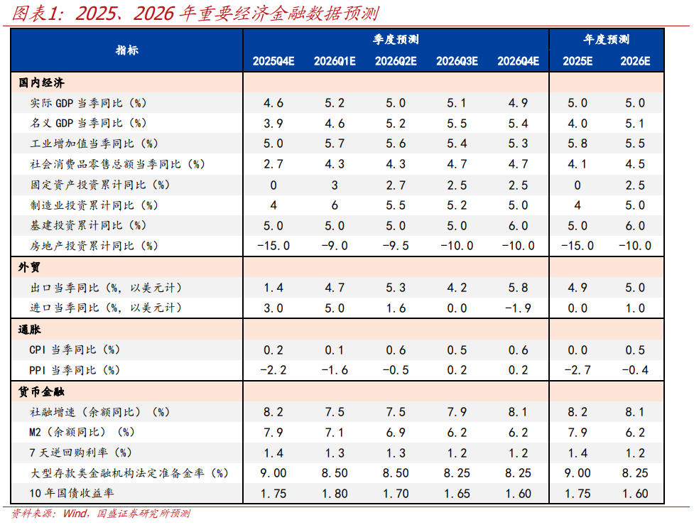 >节奏看,25年Q3以来经济边际走弱,经济有一定下行压力,考虑“十五五”开门红和扭转下行压力,预计2026年政策基调维持积极扩张,预计2026年Q1-Q4实际GDP当季增速有望达到5.2%、5.0%、5.1%、4.9%,全年GDP实际增速5.0%左右。通胀水平低位温和回升,全年平减指数同比0.1%左右,名义GDP增速为5.1%左右。