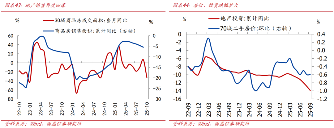 四季度至2026年,地产投资跌幅维持低位,政策有望进一步放松。如我们前期报告《四大维度:地产何时能见底?》所述,从“地产供给、地产需求、居民债务、住房价格”四大维度分析,目前我国存量住房已足够、库存也在高位,房地产市场从增量时代进入存量时代,新增投资、新开工、新房销售等受到影响,值得关注的是近两年已出台的一系列地产政策正在逐步发挥作用,销售等降幅有所收敛,“去地产化”对整体房地产的利空在逐步,对宏观经济的整体拖累在逐步下降,距离“止跌回稳”的目标已经不远,预计2026年房地产政策有望进一步放松,亟待持续用力推动地产止跌回稳,如降低房贷利率和购房税费负担、优化收储、进一步“保主体”等。