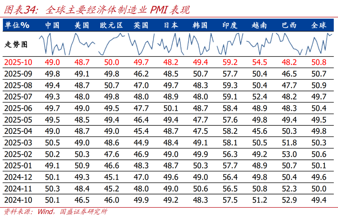 回顾2025年,全球经济温和修复,但区域分化明显。年初以来,全球制造业PMI围绕荣枯线上下波动,整体表现略好于2024年底。分国别来看,发达经济体PMI大多处在荣枯线以下,其中欧洲PMI持续回升至荣枯线以上,表现最佳;新兴经济体中,印度、越南等东南亚国家表现较好,巴西表现较差。