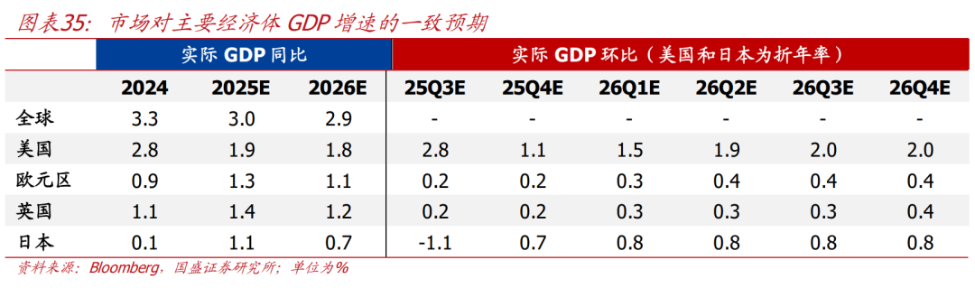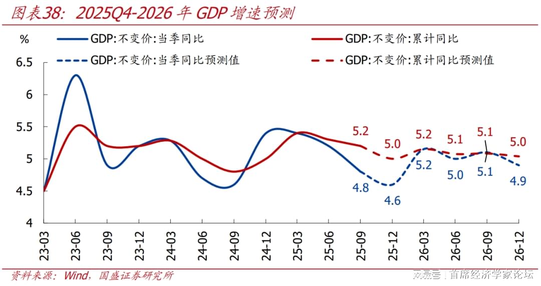 2、国内看,内需温和修复、出口韧性仍强;GDP增速前高后低,有望继续“保5%”。展望2026年,预计出口韧性仍强;政策有望继续加码、内需温和修复;GDP目标可能仍定为5%左右,增速前高后低,Q1-Q4当季增速分别为5.2%、5.0%、5.1%、4.9%,名义GDP增速有望回升。