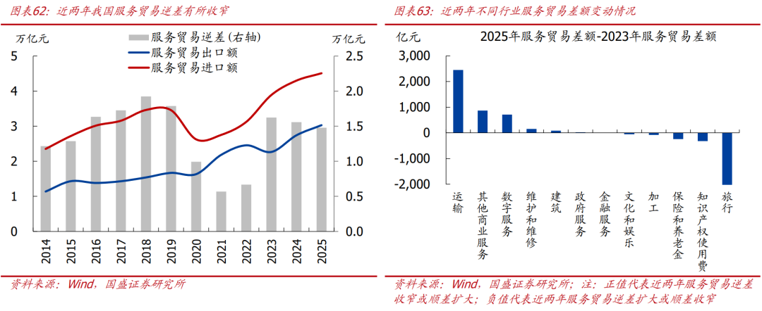 服务贸易方面,近两年服务贸易逆差有所收窄,运输服务贸易逆差大幅收窄,其他商业服务和数字服务贸易顺差扩大。2023年,我国服务贸易逆差约1.62万亿元,到2024年,服务贸易逆差收窄至1.56万亿元,2025年可能进一步收窄至1.48万亿元。分行业看,运输服务贸易逆差大幅收窄,核心驱动是我国本土船队运力的提升与跨境电商的规模化出海;数字服务贸易顺差持续走阔,则得益于我国科技产业竞争力提升带来的软件、云计算及信息外包出口加速放量。