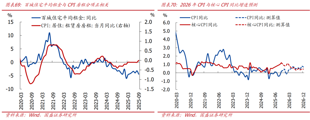 接着分析核心CPI:CPI房租分项与百城住宅平均租金显著正相关,近一年来百城住宅平均租金同比下跌4%左右,假设2026年以同等幅度下跌,则预计带动CPI房租分项下跌0.3%左右。其余多数分项环比有一定的季节性规律,因此可在季节性均值的基础上做调整:如家用器具、通信工具等受以旧换新政策影响,价格可能略强于季节性。计算得,2026年核心CPI同比中枢约为0.6%左右,与2025年基本持平。