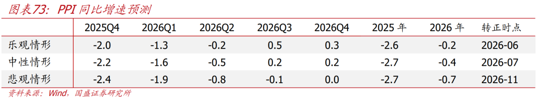 悲观情形下,假设政策效果相对有限,25Q4至26Q4上述六类商品价格中枢较中性情形下浮5%,那么2026年PPI同比中枢约为-0.7%,四季度PPI同比有望转正。