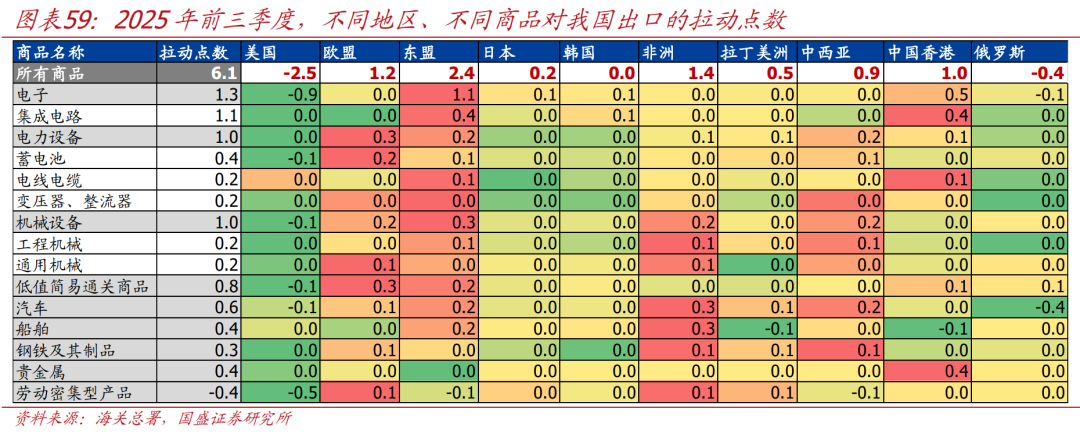 >“一带一路”持续推进+新三样等产品优势,我国在新兴市场中的份额有望继续提升。2025年前三季度,我国出口累计同比增6.1%,其中集成电路(1.1%)、蓄电池(0.4%)、机械设备(1%)、汽车(0.6%)、船舶(0.4%)、低值简易通关商品(0.8%)等是最主要拉动(括号内为不同商品对总出口的拉动点数)。AI浪潮推动集成电路出口高增(具体分析见后文);我国在电动汽车和锂离子电池领域具备产业优势,国内技术迭代与成本优势领先全球,未来出口份额可能继续提升。进一步拆分地区,以非洲为例,作为“一带一路”建设的重要方向之一,我国在当地投资催生基建、机械、电力等需求,同时港口建设催生船舶需求,订单大多由国内厂商承接,拉动我国出口增长。