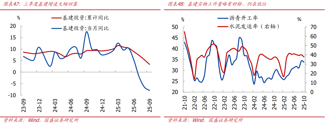 2025年上半年基建增速高增,三季度大幅回落。1-9月广义基建投资同比3.3%,9月当月同比-8.0%,较上半年的8.9%大幅回落,主因财政发力节奏偏慢、地产下行加剧地方财政紧张等。沥青、水泥等实物工作量指标略有好转、整体也仍在低位。