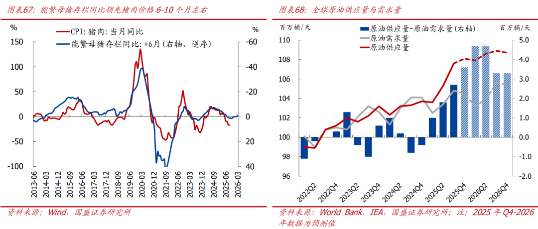 >猪周期目前处在筑底阶段,2026年猪价可能温和回升。如CPI部分所述,当前生猪价格为11.5元/千克,中性情形下,2026年底预计温和上涨至13.5元/千克。