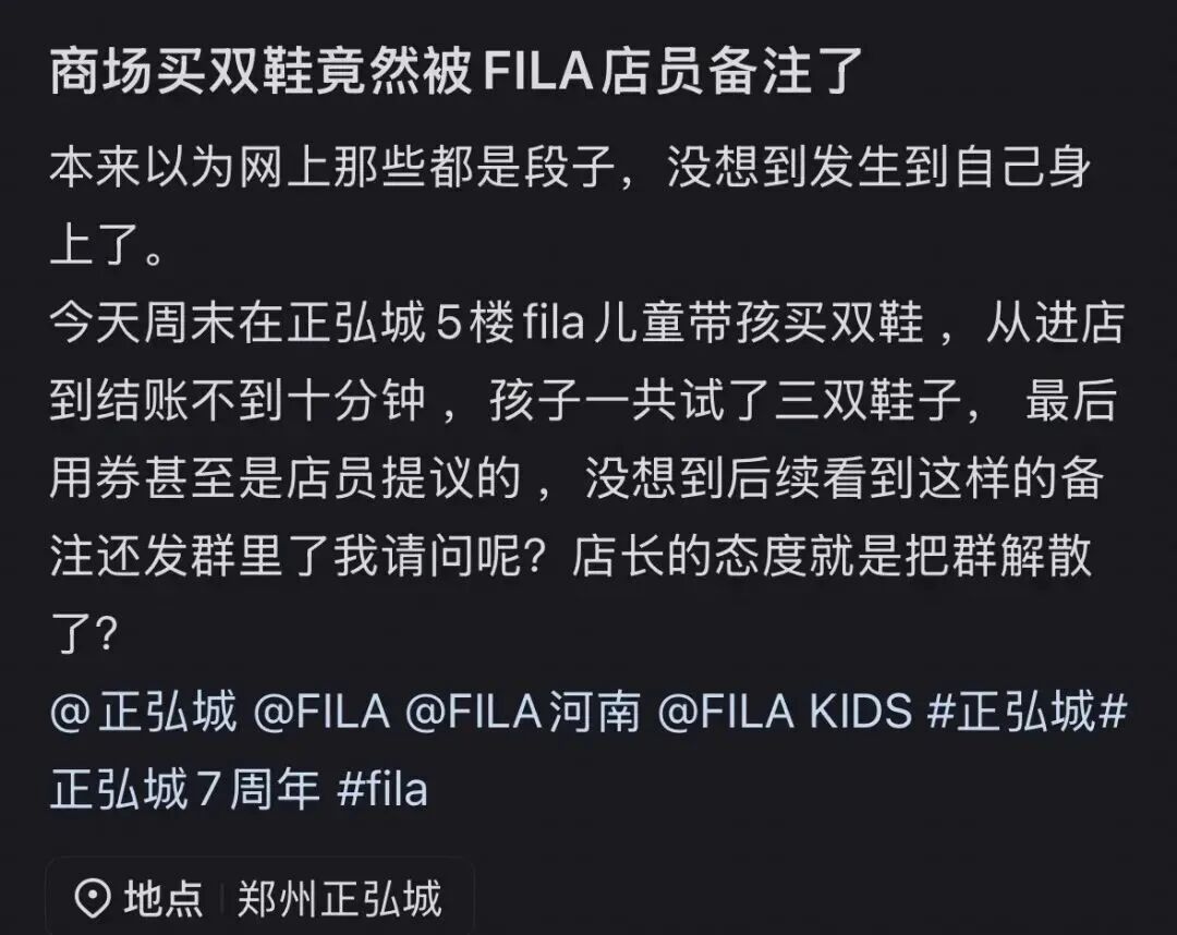 近日,有网友在互联网平台发文,称自己周末在河南郑州一家商场的“FILA KIDS”门店购物,从进店到结账不到十分钟,“孩子一共试了三双鞋子,最后用券甚至是店员提议的,没想到后续看到这样的备注,还发群里了”。