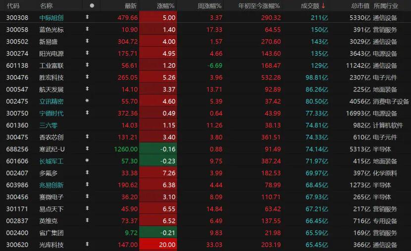 市场赚钱效应显著,共计4300只个股收涨,涨停股95只;993只个股收跌,跌停股5只。今日有5只个股日成交额超过100亿元,中际旭创收涨5%报479.66元/股,新易盛收涨4%;蓝色光标继续飘红,涨1.4%;阳光电源涨近5%,宁德时代微涨;胜宏科技、立讯精密、兆易创新涨势不错;多氟多今日大涨7.26%。