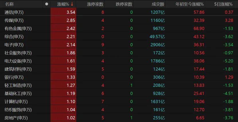 31个申万一级行业中,除了国防军工、交通运输微跌,其余均收涨,14个板块涨幅超过1%。通信、传媒、有色金属、电子板块领涨,石油石化、食品饮料、农林牧渔微涨。