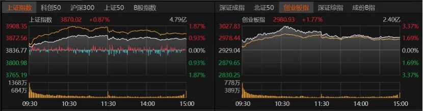 截至今日收盘,沪指收涨0.87%报3870.02点,创业板指收涨1.77%报2980.93点,深证成指收涨1.53%。科创50、沪深300、上证50、北证50均收红,但涨幅均不超过1%。