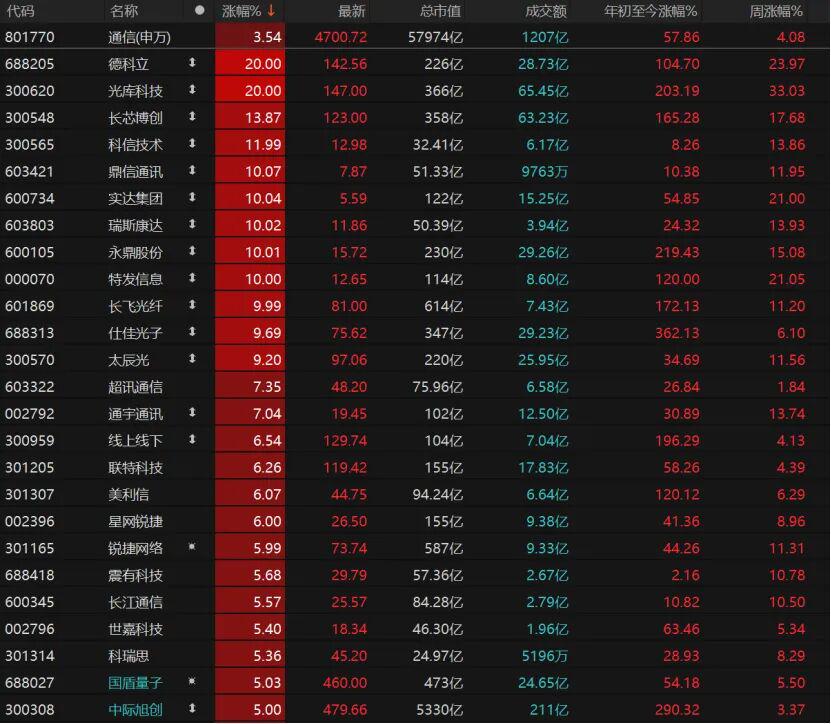 8只通信个股涨停,德科立、光库科技“20cm”涨停,长芯博创、科信技术涨幅超过10%,鼎信通讯、实达集团、瑞斯康达、永鼎股份、特发信息、长飞光纤涨停。