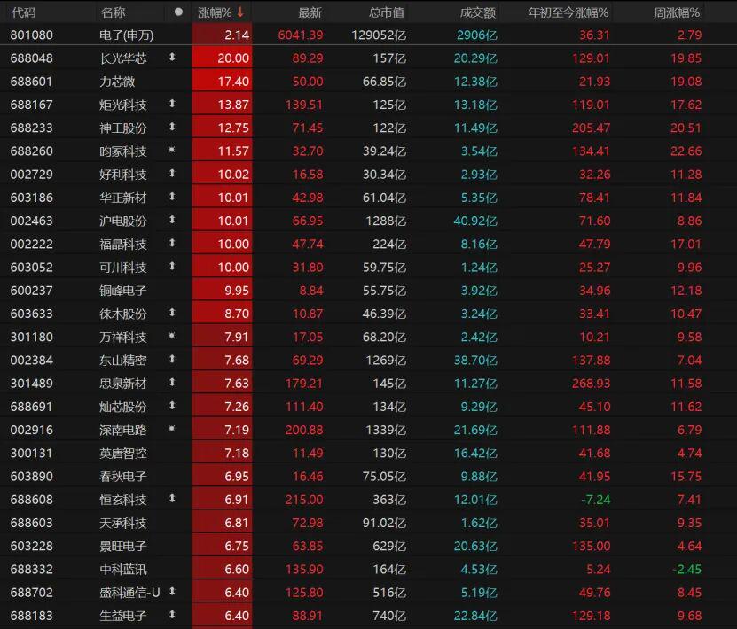 9只电子股涨停,长光华芯“20cm”涨停,好利科技、华正新材、沪电股份、福晶科技、可川科技、铜峰电子涨停。