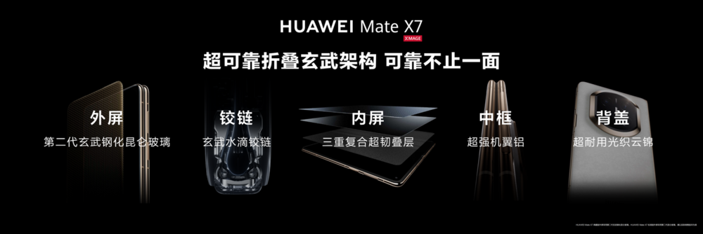除此之外,华为Mate X7 在用户最关注的「折叠耐久度」问题上,也进行了全面加强。外屏采用第二代玄武钢化昆仑玻璃,全新玄武水滴铰链的强度和稳定性也再次得到提升,可在任意角度稳稳悬停;内屏采用超韧三重叠层结构,通过UTG玻璃抗压+碳纤维支撑+ 非牛顿流体保护的精妙组合,攻克折叠屏“易损、易折、易老化”的行业难题。相较上一代,抗冲击能力提升20%,抗弯折能力跃升100%,耐弯抗冲、开合无忧。