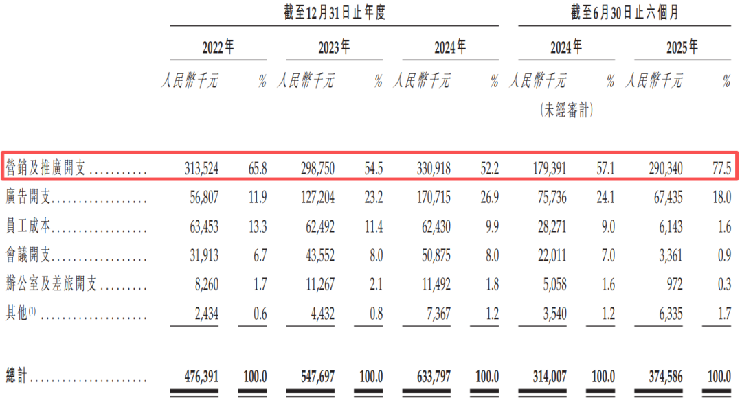 其中营销与推广开支是主要构成,2022年至2024年占销售开支的比例均超过50%,今年上半年占比超过七成。