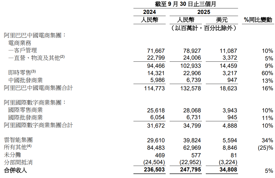 数据显示,2025年9月30日止六个月,阿里收入为4,954.47亿元,同比增长3%。若剔除高鑫零售和银泰的已处置业务收入,同口径收入同比增长将达到12%。