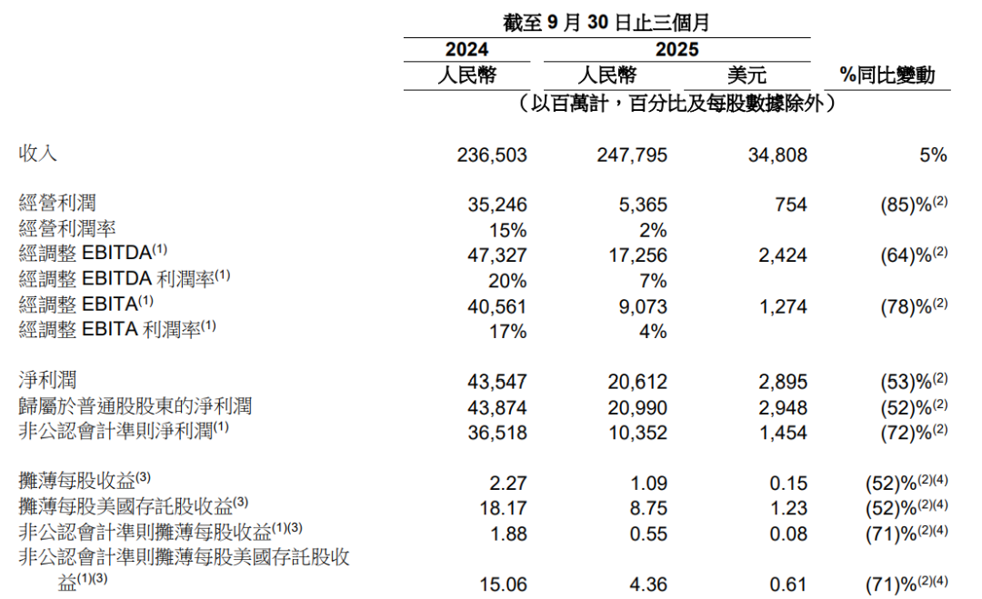 11月25日,阿里巴巴集团发布2026财年第二季度(2025年7月至9月30日)财报:集团收入2477.95亿元,超市场预期。但非公认会计准则净利润103.5亿元,同比下滑72%,大幅不及市场预期。经营利润更是大跌85%,堪称“塌方”。