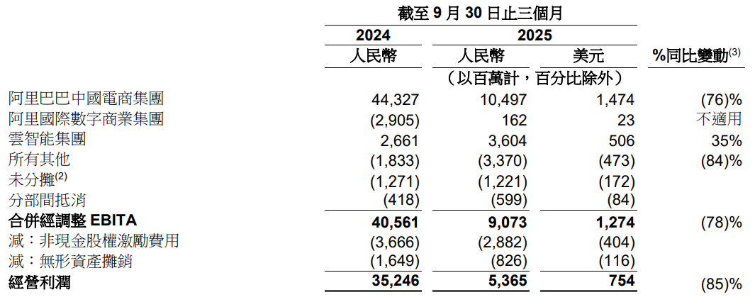 但利润数据就没那么好看了。如前面提到的,三季度阿里经营利润整体同比下降85%为53.65亿元,经调整EBITA下降78%为90.73亿元。