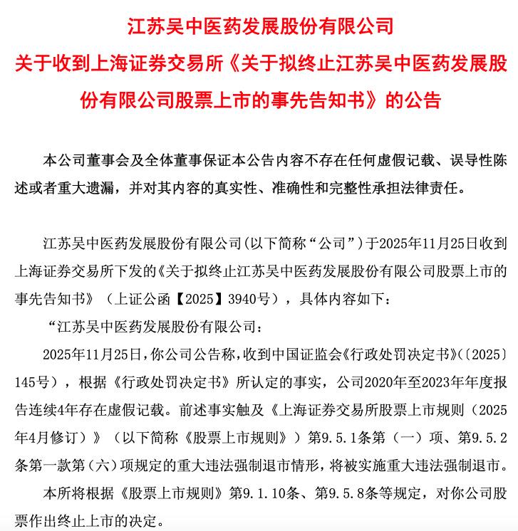同日,上海证券交易所下发的《关于拟终止江苏吴中医药发展股份有限公司股票上市的事先告知书》,指出公司触及重大违法强制退市情形,将被实施重大违法强制退市。