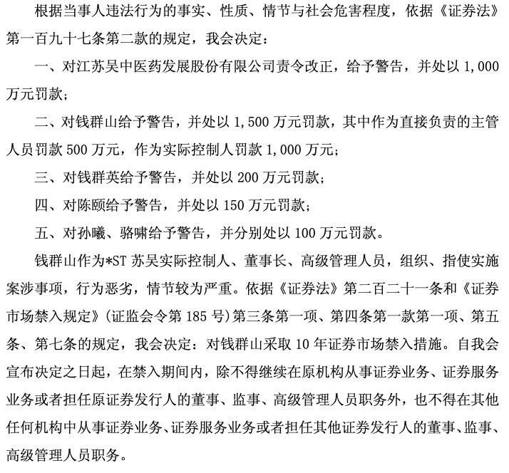 一、对江苏吴中医药发展股份有限公司责令改正,给予警告,并处以1000万元罚款;