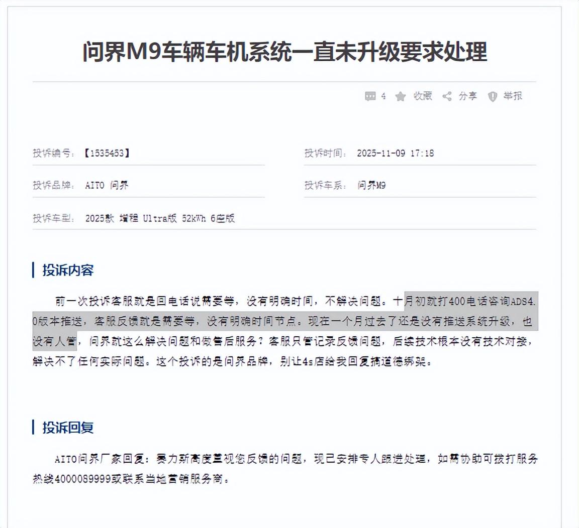再如11月9日,平台过审投诉编号1535453显示,一车主表示,问界M9车辆车机系统一直未升级,十月初就打400电话咨询ADS4.0版本推送,客服反馈就是需要等,没有明确时间节点。现在一个月过去还是没有推送系统升级,也没有人管......