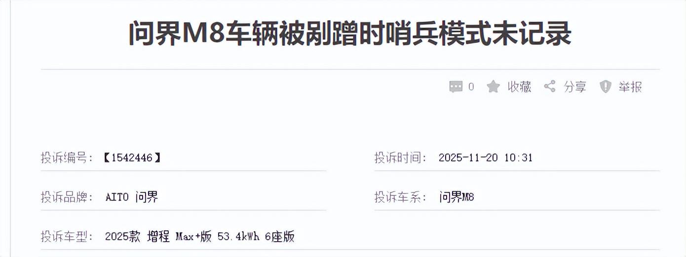 如11月20日,平台过审投诉编号1542446显示,一车主表示,自已驾驶问界M8汽车,开启哨兵模式后,车辆多次被剐蹭,但是车内无录像。该车主认为这与商家宣传不符,属于虚假宣传。