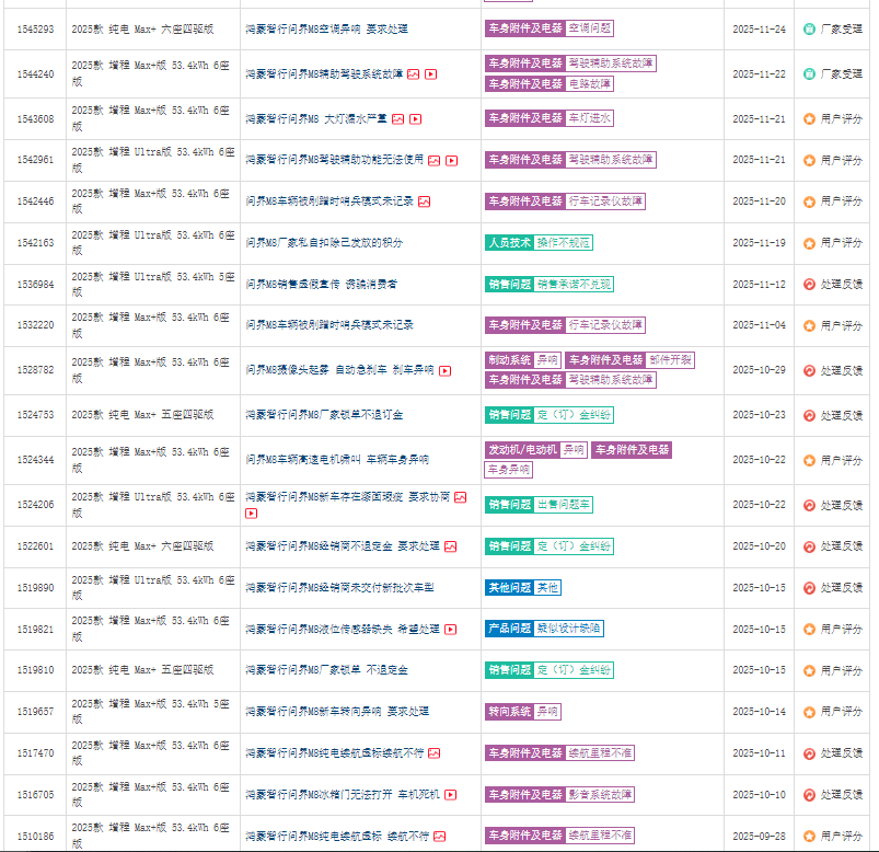 浏览车质网,一些用户反馈声音也值审视,质疑主要集中在产品质量、售后服务上,问界M9、M8、M7等热门车型均有涉及。