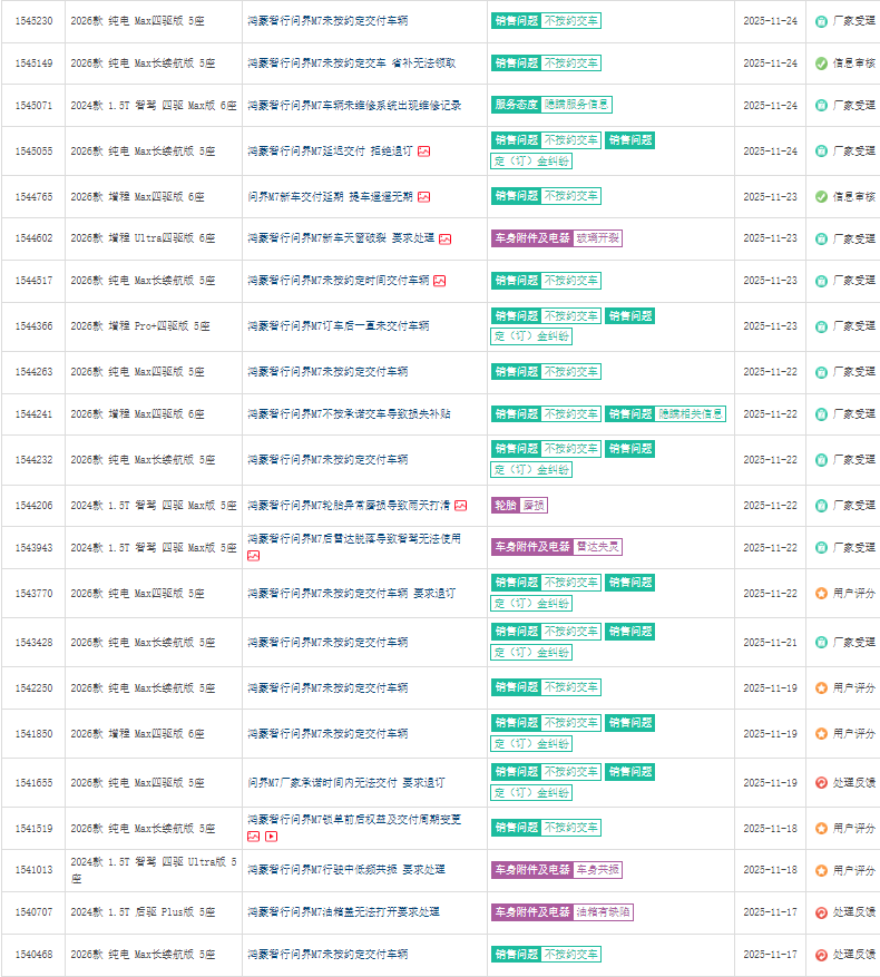 如11月25日,平台过审投诉编号1545812显示,一车主称问界M7行驶中低频共振要求处理。