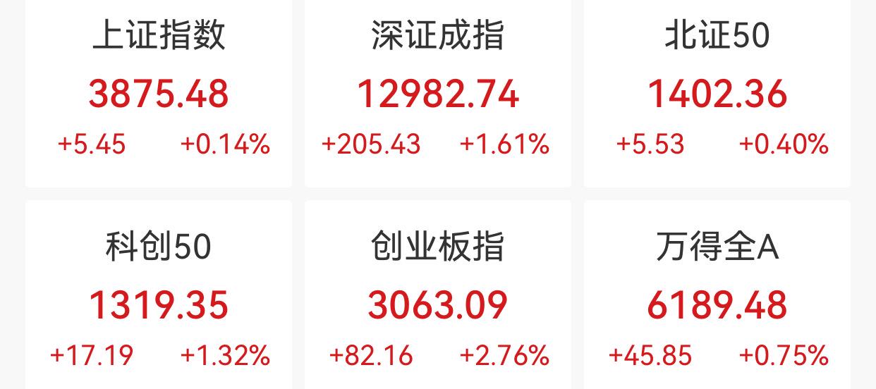 中新经纬11月26日电 26日上午,A股三大指数低开高走,创业板指领涨。截至午盘,上证指数涨0.14%,报3875.48点;深证成指涨1.61%,报12982.74点;创业板指涨2.76%,报3063.09点。