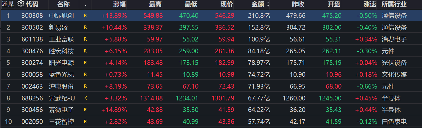个股方面,中际旭创、新易盛、工业富联半日成交额均在100亿元之上。