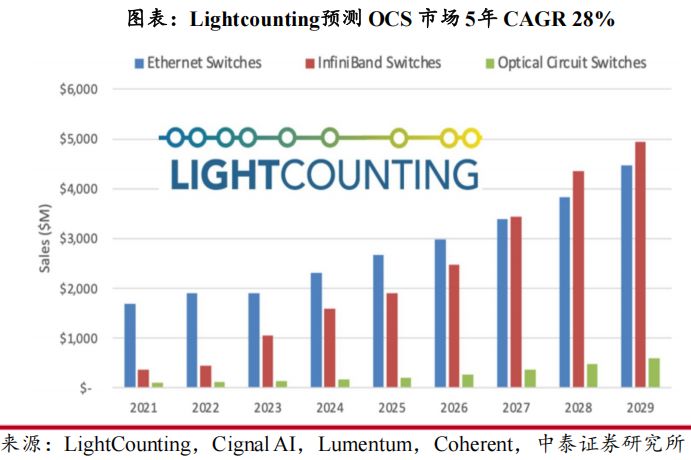 除谷歌作为目前OCS交换机方案主要应用方需求保持高速年增以外,微软、Meta、亚马逊AWS也都在探索自己的光交换网络。根据Lightcounting预测,2024-2029年OCS的市场规模有望以28%复合增速增长。