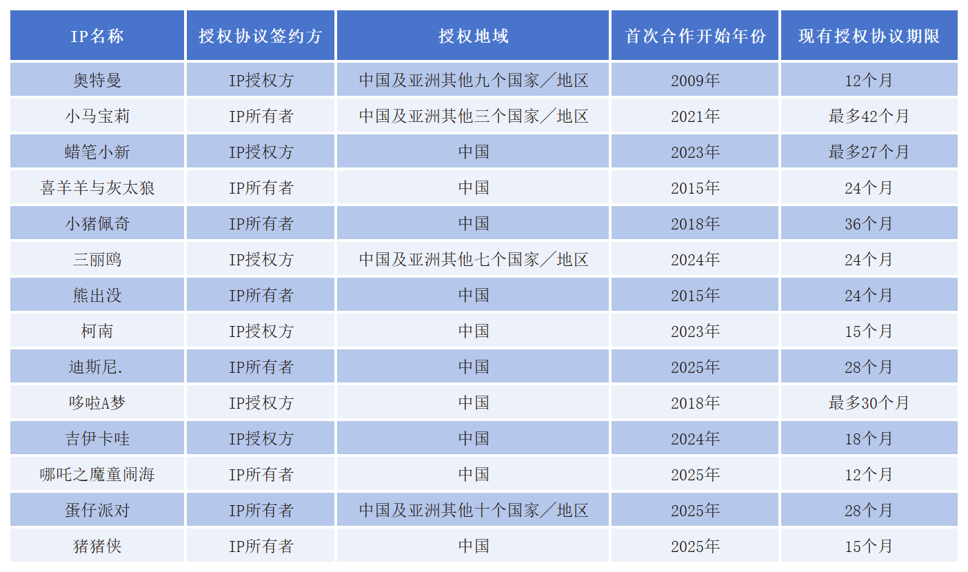 目前,奥特曼IP的授权协议期限仅剩12个月,柯南的授权期限剩15个月,喜羊羊与灰太狼的授权期限剩24个月。这意味着,一旦核心IP授权到期且无法成功续约,将对公司业绩可持续性造成重大影响。
