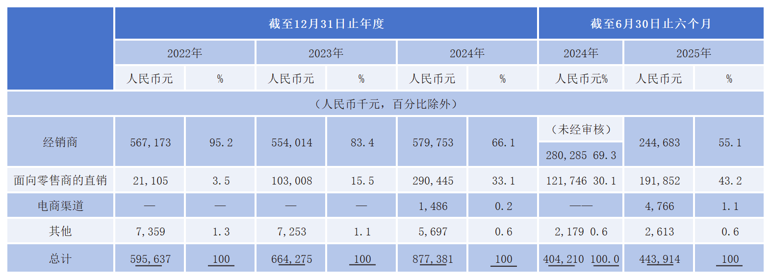 2025年上半年,公司来自经销商收入占比已降低至55.1%。相较之下,直销收入占比则一路飙升至43.2%。
