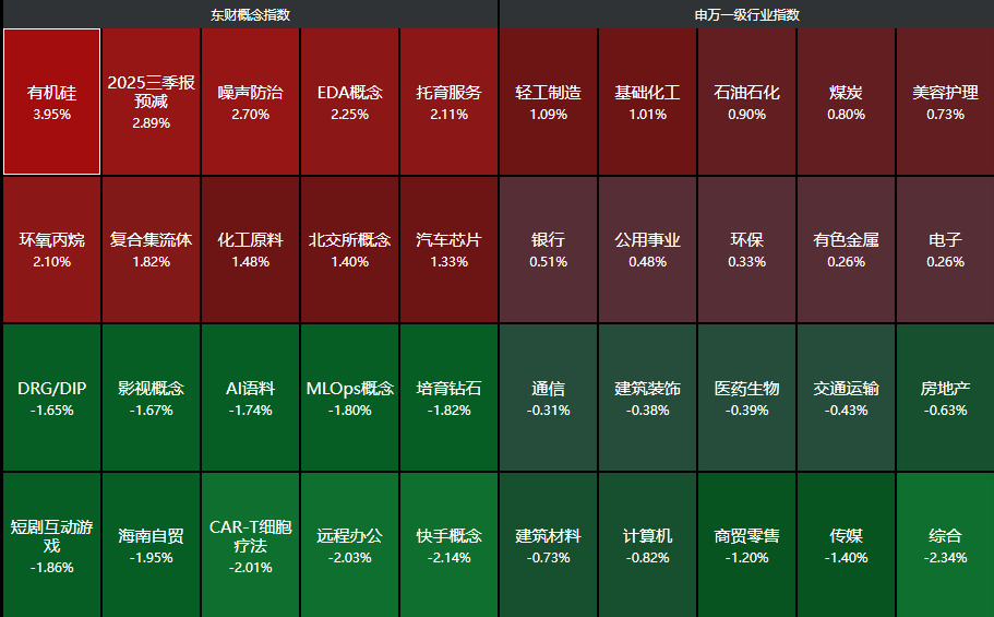分行业来看,轻工制造、基础化工、石油石化、煤炭等行业领涨,综合、传媒、商贸零售等行业领跌。