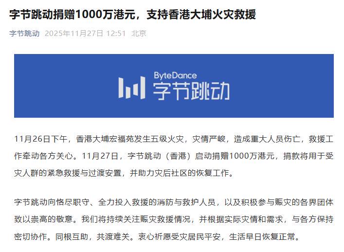 字节跳动(香港)启动捐赠1000万港元,捐款将用于受灾人群的紧急救援与过渡安置,并助力灾后社区的恢复工作。